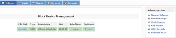 當配置好系統(tǒng)的安全訪問控制后,接下來的一步是配置系統(tǒng)磁盤,實現(xiàn)虛擬存儲服務。在 Openfiler 中,有三類存儲概念:Block Device,Physical Volume 和 Volume Group。其中,Block Device 表示的是實際的物理磁盤;Physical Volume 表示的是物理磁盤的分區(qū),它是組成 Volume Group 的單元;Volume Group 則是由一個或多個物理磁盤分區(qū)(Physical Volume)組成,它又是組成 Logical Volume 的單元。